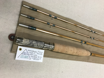 --SOLD-- This is one of our most popular rods. It's one of our pentagonal Signature Rods that is now available. It is a model S805, serial #1049, a hollowed, 8'0" 2 piece fly rod for a 5/6 weight line. It is flamed brown color, with blued nickel silver ferrules with a knurled, down-locking reel-seat, with a beautiful varnished English Walnut wood reel-seat insert, with green & black silk wraps and a 6" tapered grip, made out of 1/2" cork rings. The butt cap has our logo engraved on it. It has a medium+/fast action with plenty of reserve power and is perfect for streams and lakes, a good all-round rod. Click here to view the complete list of our Signature models, and click on the image for a more detailed view. This rod is available now for $1199.99. As all our rods, it comes in a high quality aluminum rod tube with our logo and a quality cloth bag.